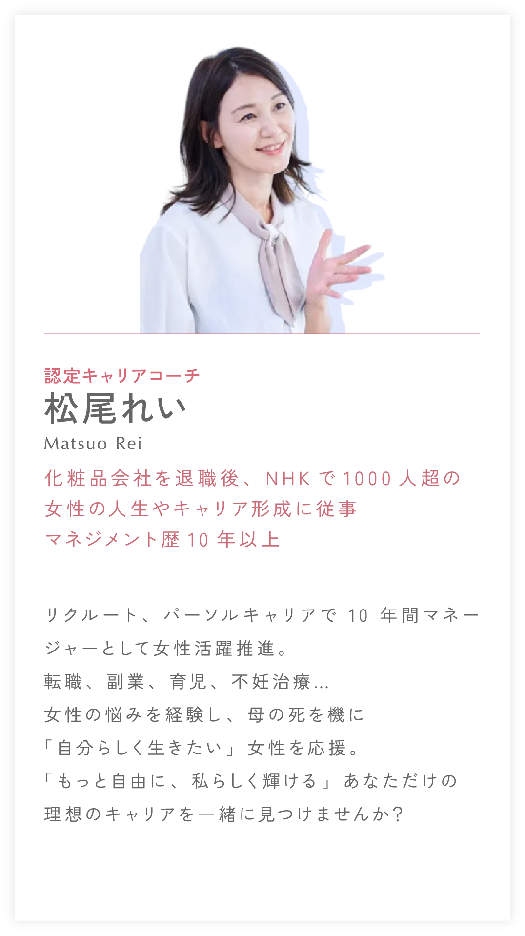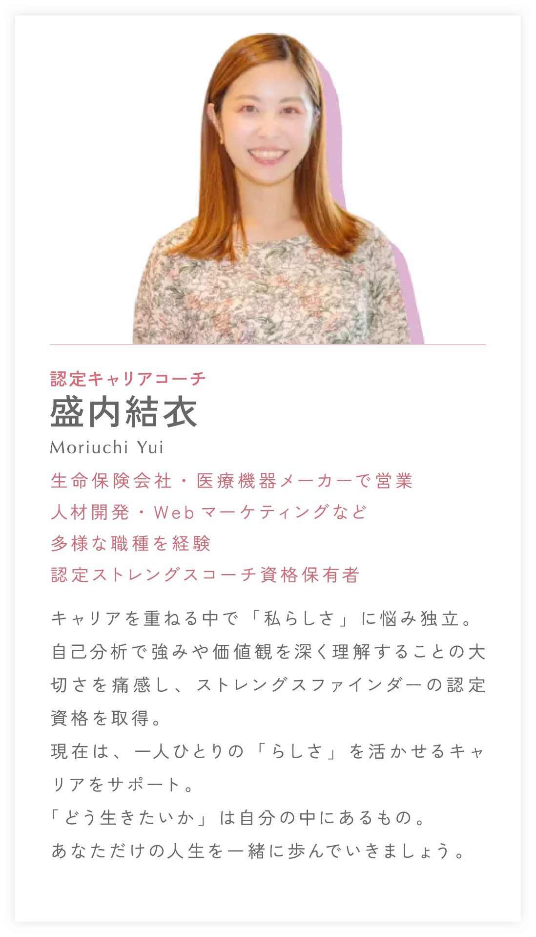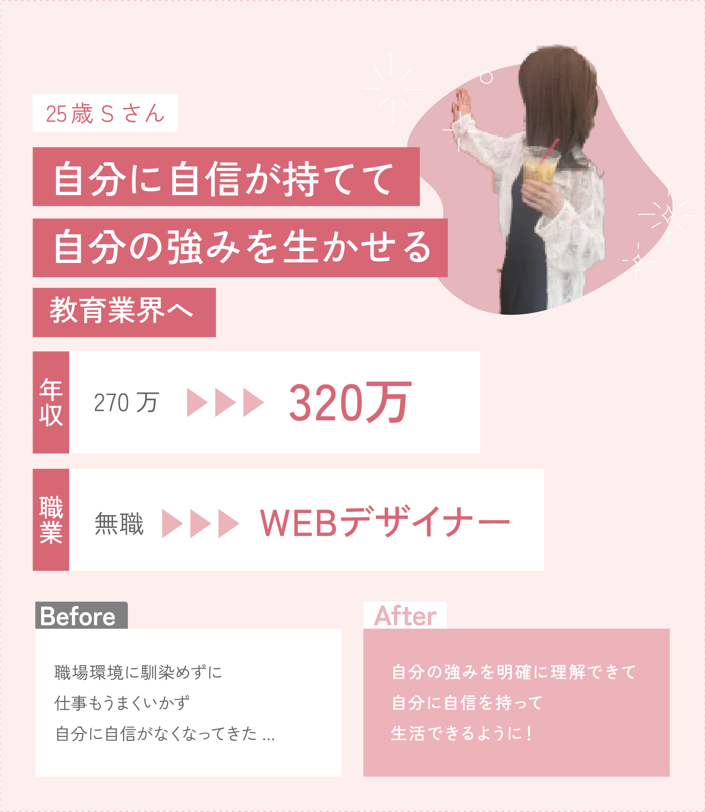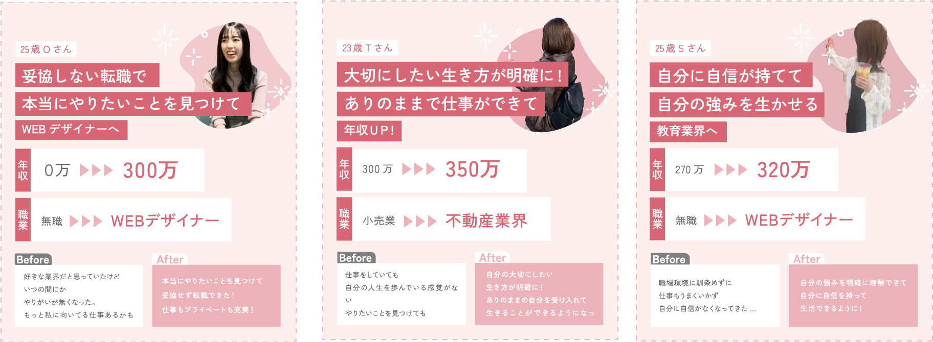 ●キャリアデザイン ・徹底した自己分析 ・業界・職種分析 ・適職リサーチ ●転職活動サポート ・書類対策 ・面接実践トレーニング ・企業研究 ●思考サポート ・思考の癖を整える ・自己効力感UP |