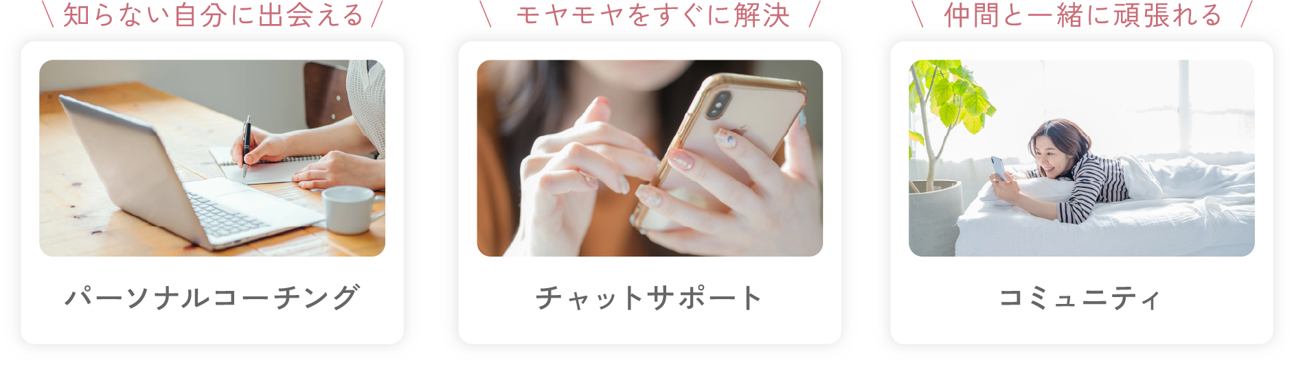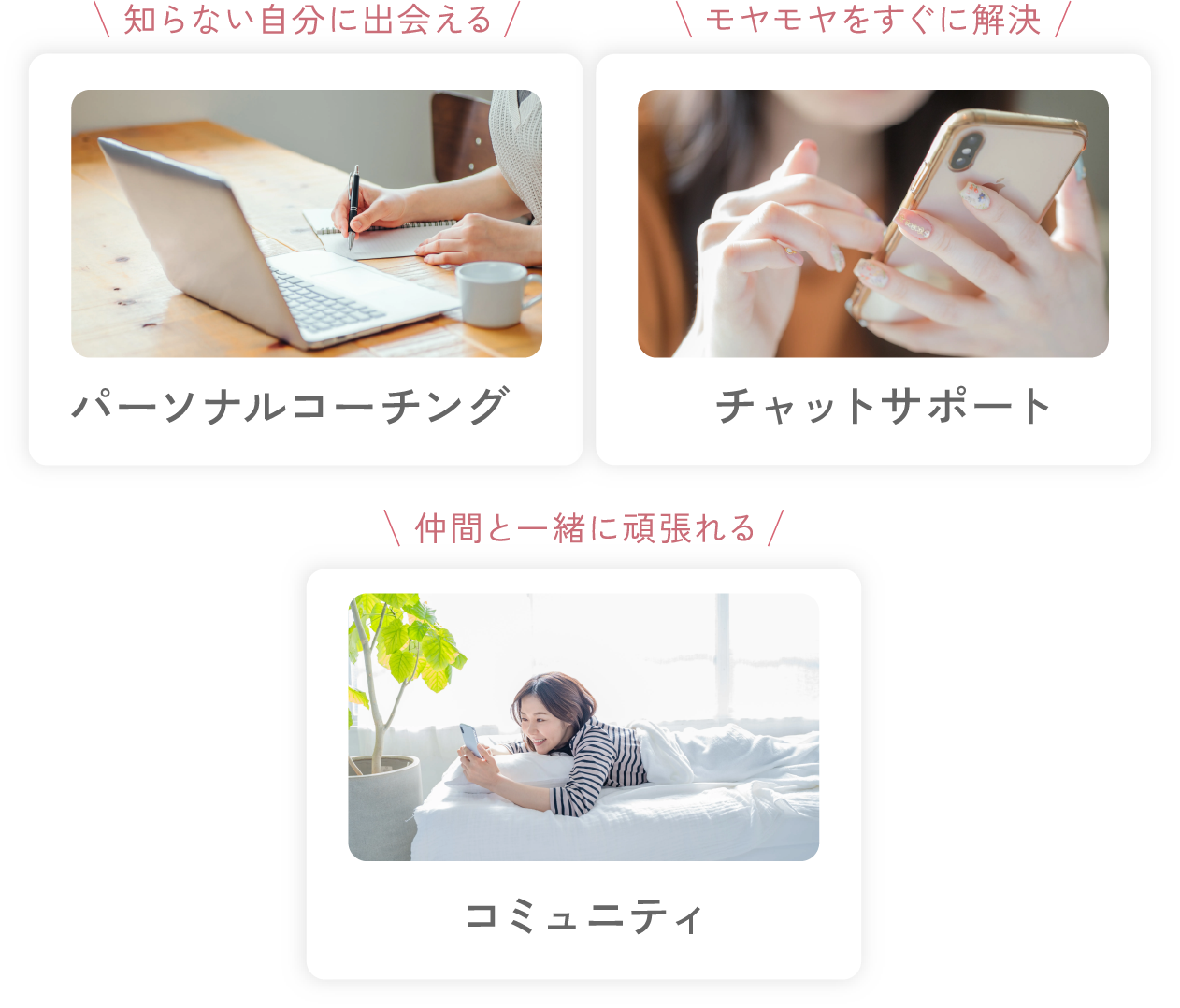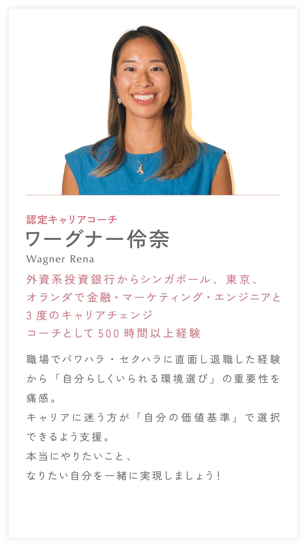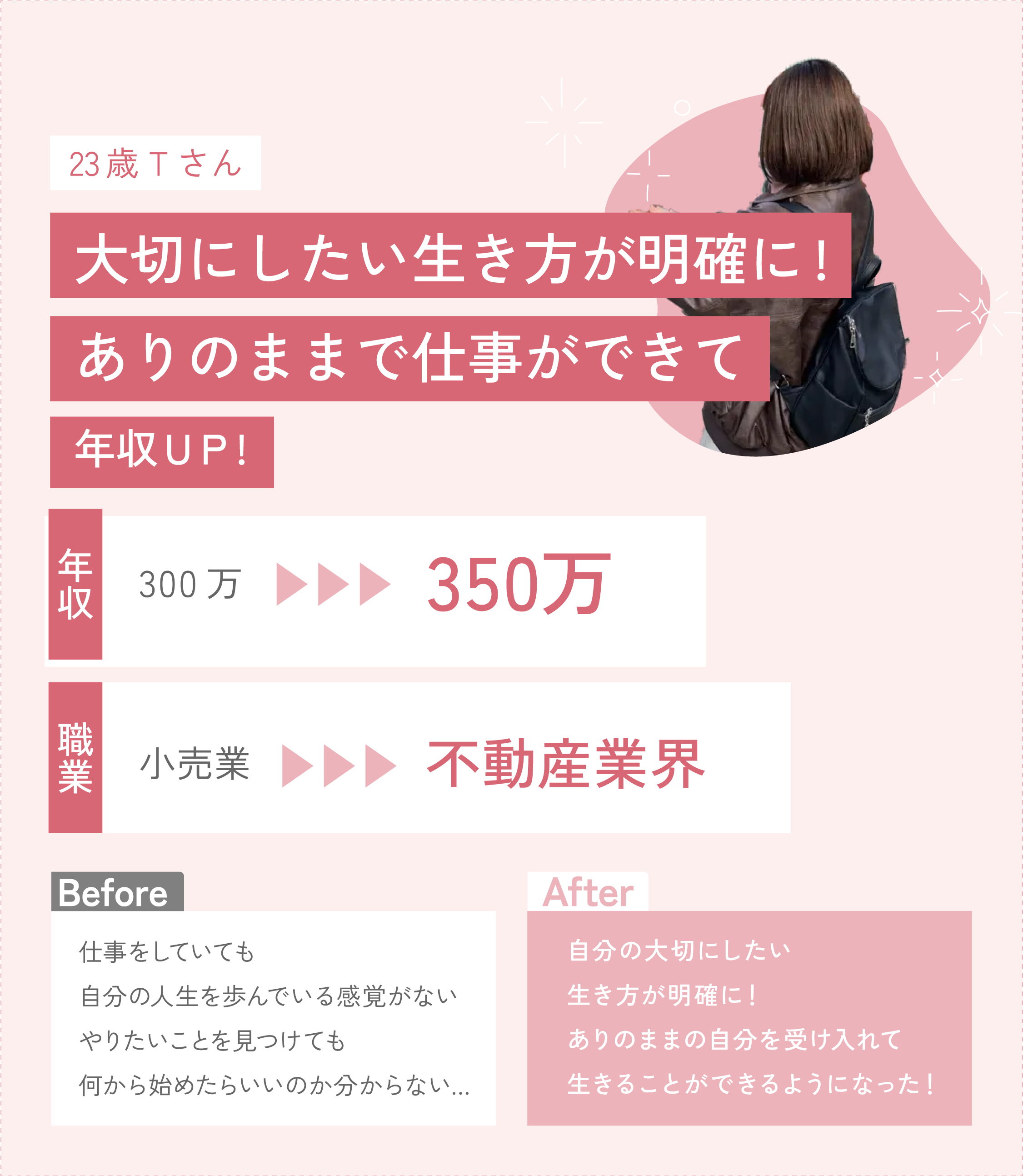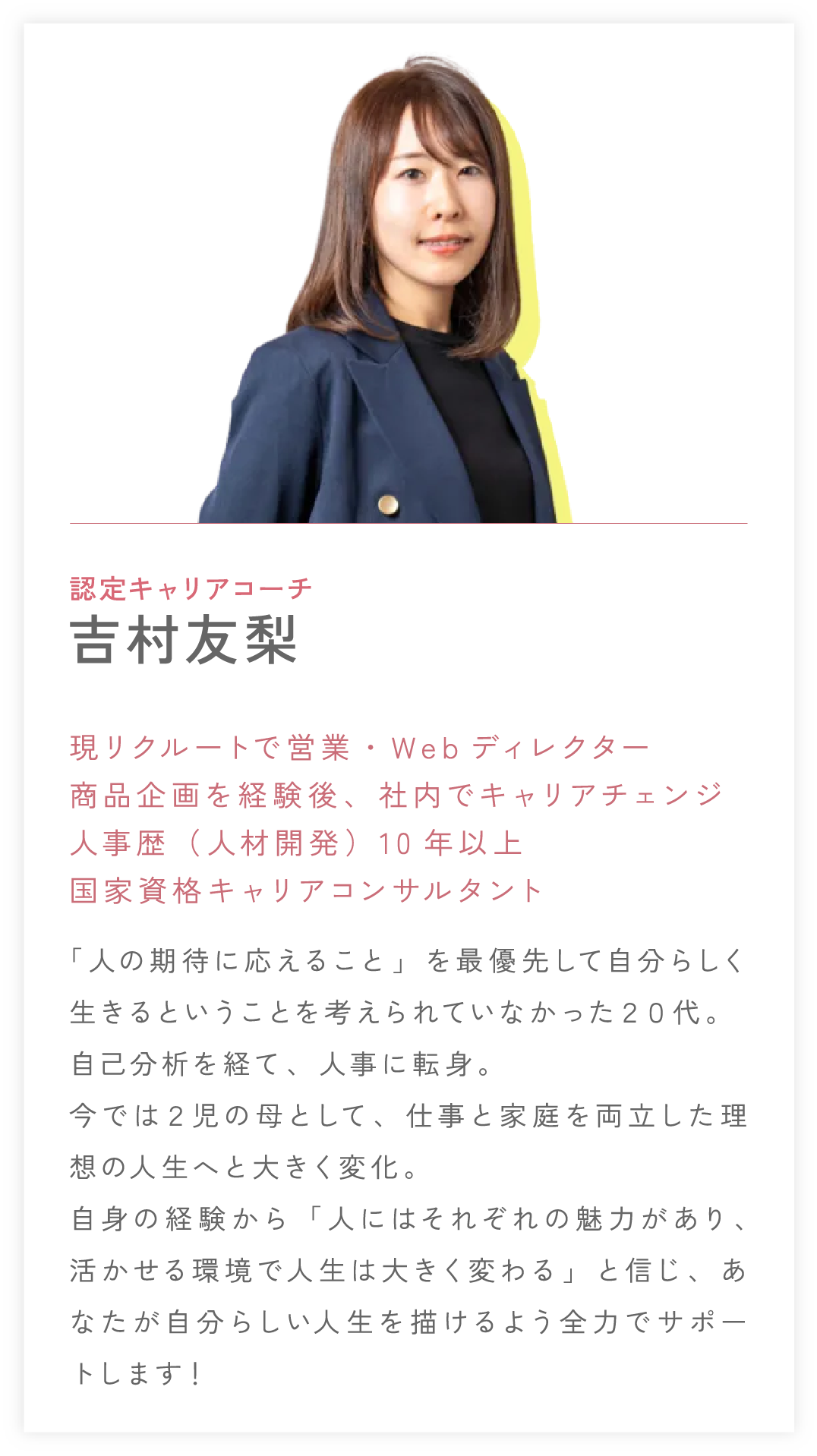 ●キャリアデザイン ・徹底した自己分析 ・業界・職種分析 ・適職リサーチ ●転職活動サポート ・書類対策 ・面接実践トレーニング ・企業研究 ●思考サポート ・思考の癖を整える ・自己効力感UP |