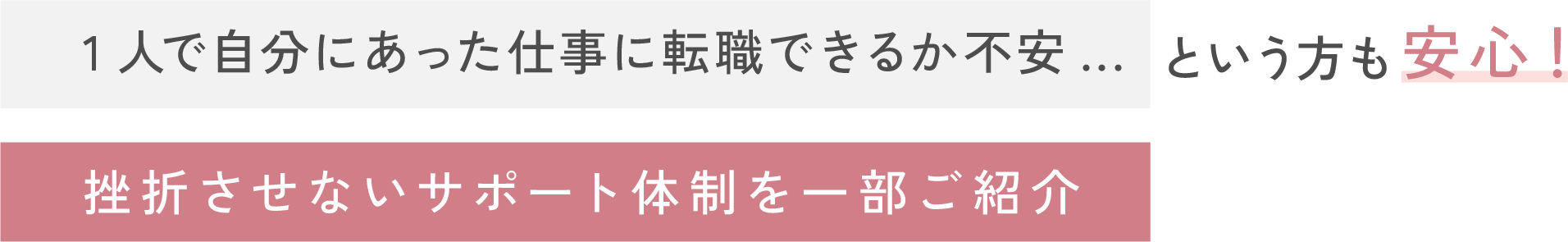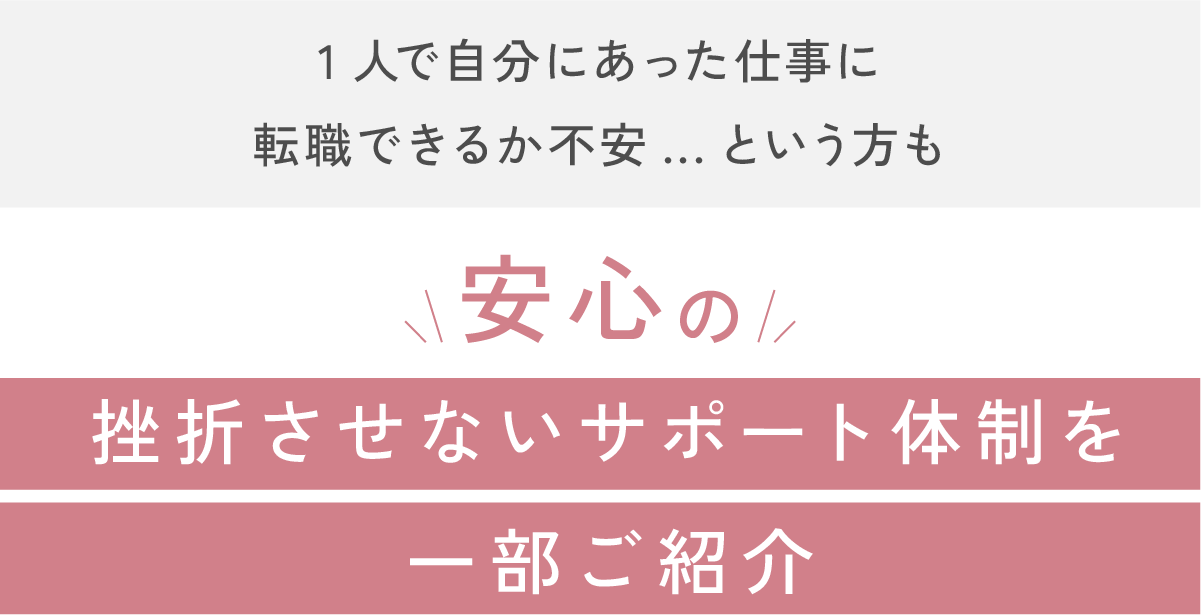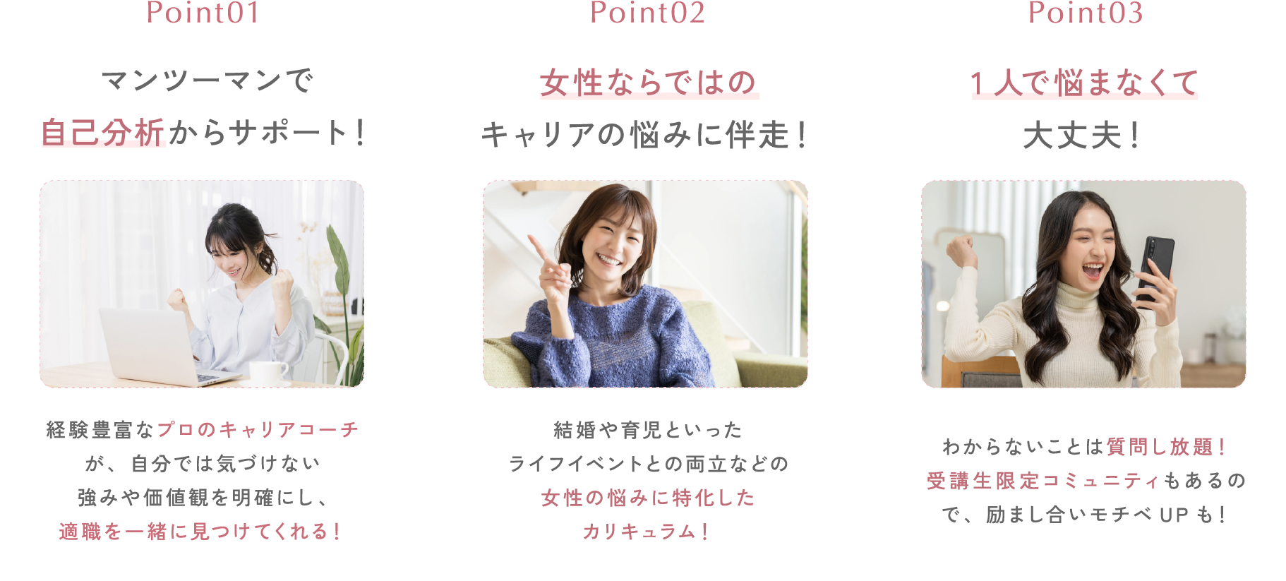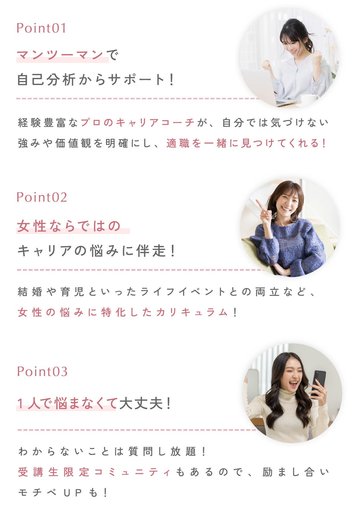 ●キャリアデザイン ・徹底した自己分析 ・業界・職種分析 ・適職リサーチ ●転職活動サポート ・書類対策 ・面接実践トレーニング ・企業研究 |