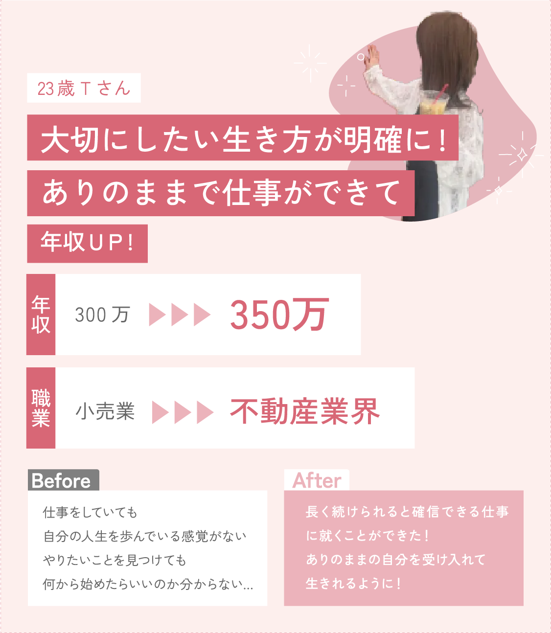 ●キャリアデザイン ・徹底した自己分析 ・業界・職種分析 ・適職リサーチ ●転職活動サポート ・書類対策 ・面接実践トレーニング ・企業研究 ●思考サポート ・思考の癖を整える ・自己効力感UP |