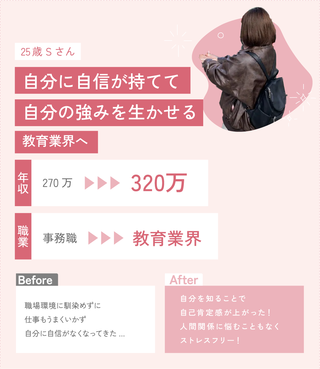 オススメの方 | ♦転職するべきか考えたい ♦適職がわかれば自分で行動したい ♦自分にあった仕事を見つけたい ♦自分の強みを知りたい |