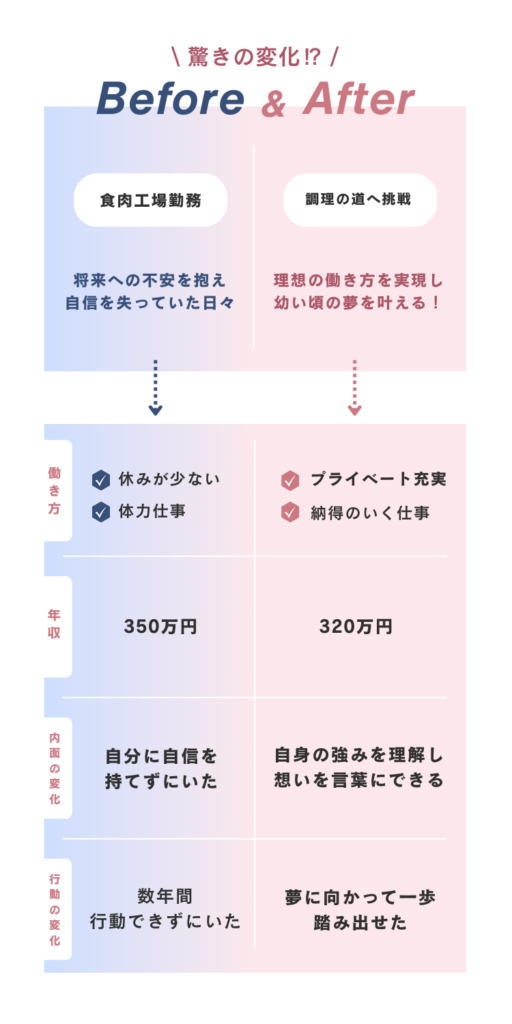 それでも、コーチと一緒に自分の理想の働き方を整理していく中で、「調理の道でも、私の理想の働き方ができる場所は必ずある」と思えるようになったんです。