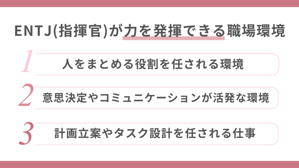 ENTJ(指揮官)は、考えて動く余地がある環境でこそ力を発揮できるタイプです。