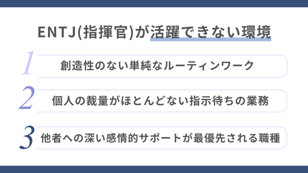 全体像を捉えながら自ら判断し、戦略的に動くことで力を発揮するENTJ(指揮官)にとっては、自由度の低さや判断範囲の狭さに、窮屈さを感じるでしょう。