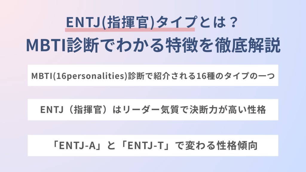 ENTJ(指揮官)は、MBTI(Myers-Briggs Type Indicator)診断で紹介される16タイプのうちの一つです。