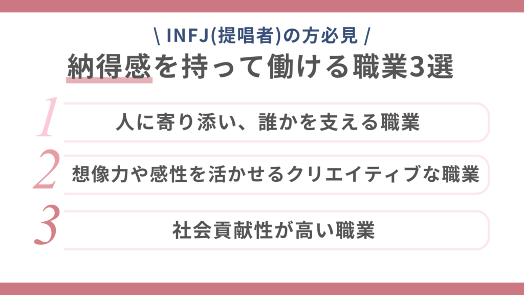 いずれも、一人ひとりと丁寧に向き合う場面が多く、INFJ(提唱者)の共感力や洞察力が自然と活かされます。