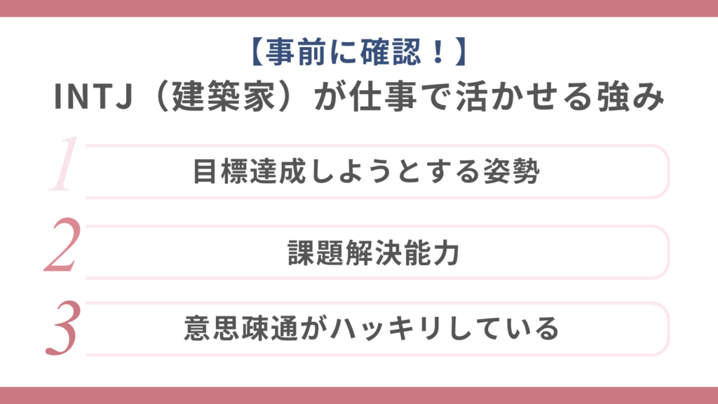 INTJ(建築家)の強みは、論理的思考力・分析力・計画性・独創性です。こうした強みを活かせる環境であれば、力を発揮しやすく、仕事の満足感にもつながるでしょう。