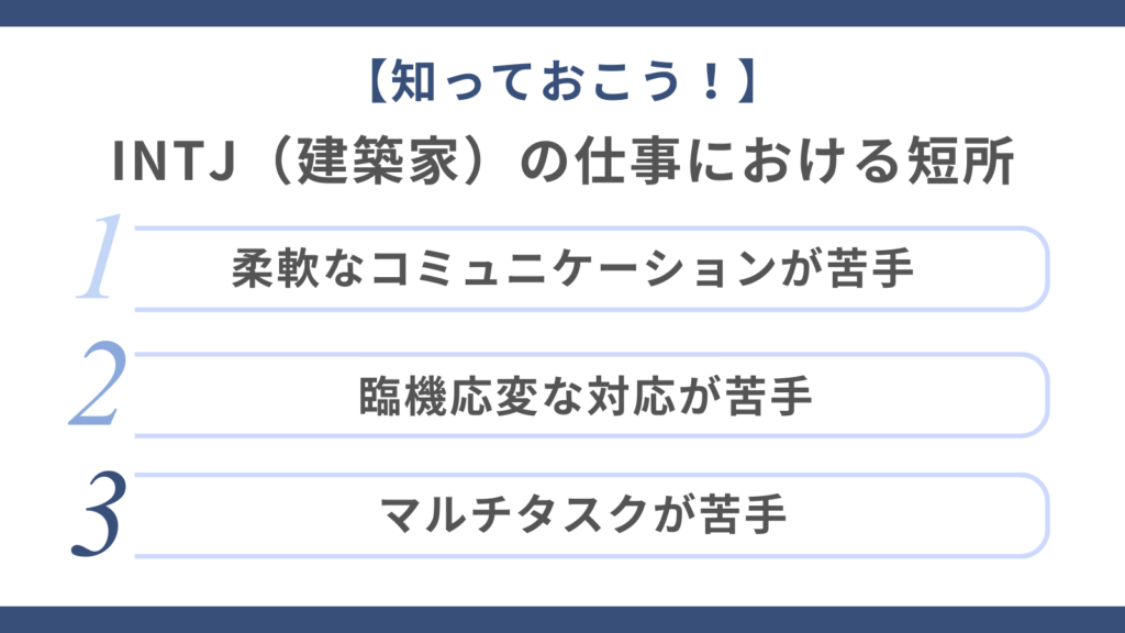 INTJ(建築家)の弱みは、柔軟なコミュニケーションや臨機応変な対応が苦手な性格的特徴です。