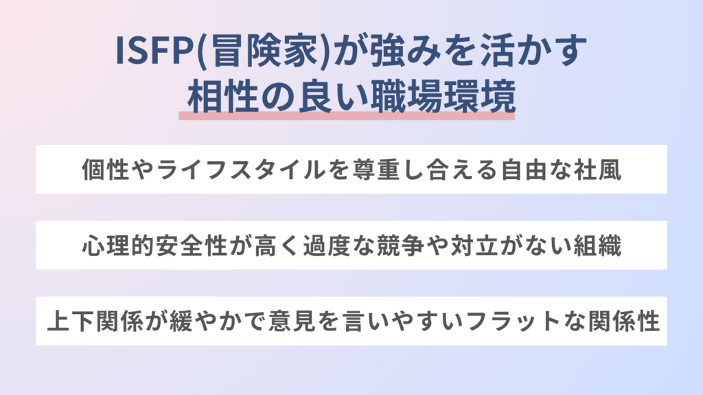 ISFP(冒険家)が持つ「自分らしくありたい」という願いを叶え、心地よく働ける環境のポイントを順番に解説します。