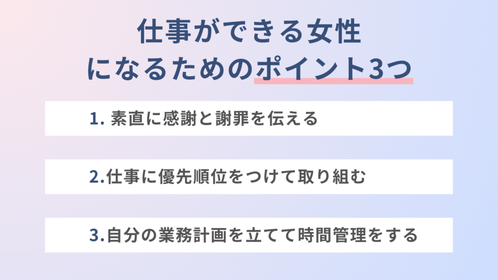 ポイントを押さえることで、周りから評価される働き方に近づけるでしょう。仕事ができる女性になるために、特に意識したい3つのポイントを紹介します。