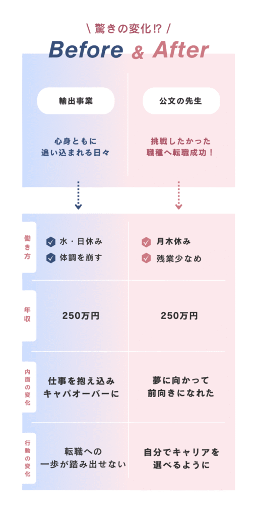 そして今回、長年の願いだった「子どもと関われる仕事」へ転職を実現。仕事に追われていた日々から抜け出し、家族と自分を大切にできる働き方へと大きく変わっていきました。