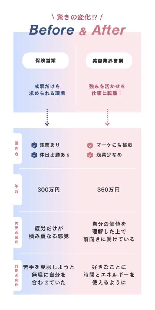 将来、結婚や出産を考えたときに、今と同じ成果や働き方を求められる自信もなく……。でも自分の強みや活かせるスキルが分からず、どう動けばいいのか迷っていました。